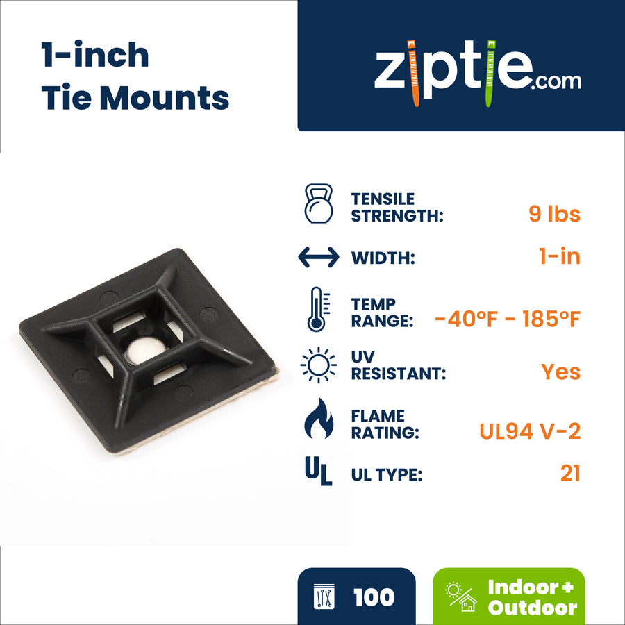 • 1-inch UV Resistant Black Zip Tie Mount, UL 21 Listed, 100-Pack